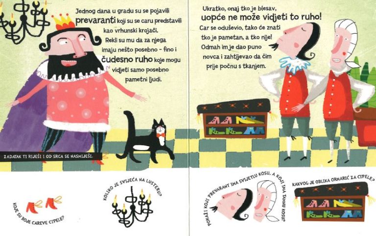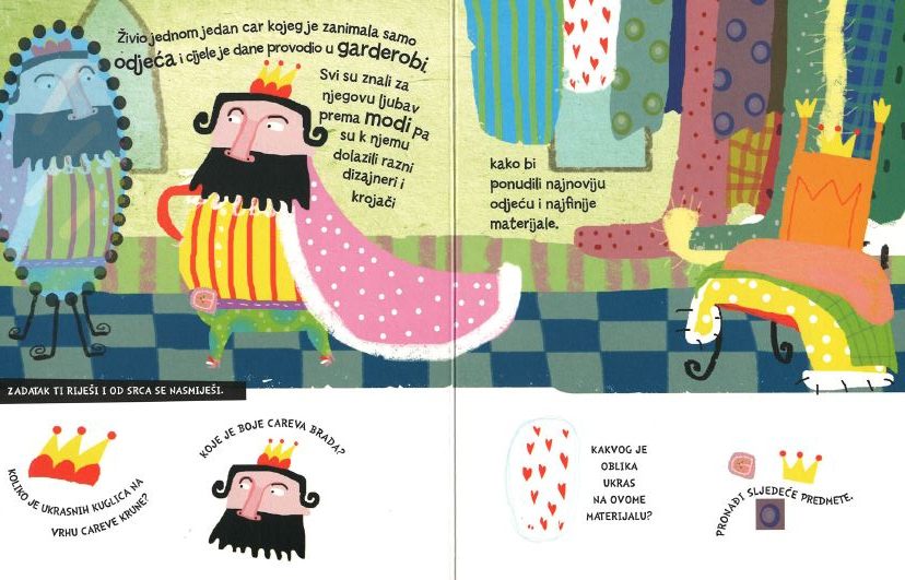 Bajka o carevom novom ruhu prikazana je na jednostavan način prilagođen najmlađima, privlačnom ilustracijom i kratkim rečenicama. Popratna jasna pitanja koja su povezana s prizorima potiču dijete da govori o bojama, brojevima, oblicima i suprotnostima te tako razvija svoj govor i uči o svijetu oko sebe.