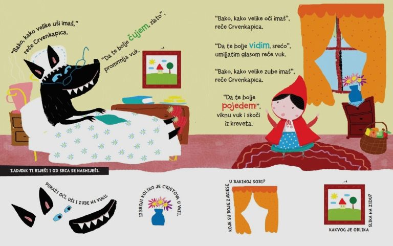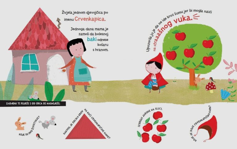 Bajka o Crvenkapici prikazana je na jednostavan način prilagođen najmlađima, privlačnom ilustracijom i kratkim rečenicama. Popratna jasna pitanja koja su povezana s prizorima potiču dijete da govori o bojama, brojevima, oblicima i suprotnostima te tako razvija svoj govor i uči o svijetu oko sebe.