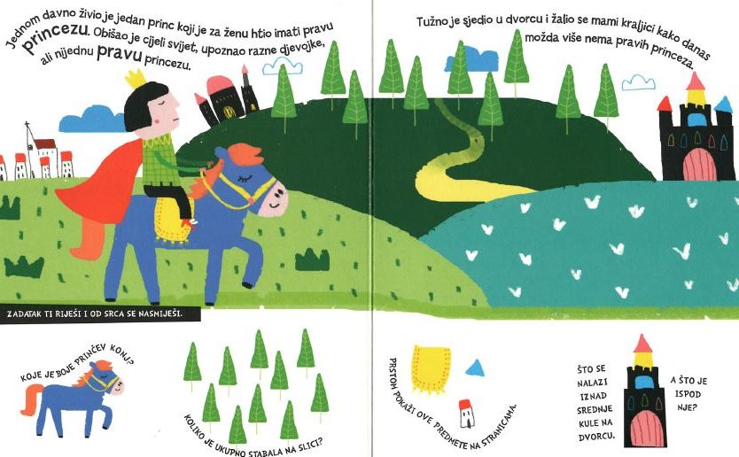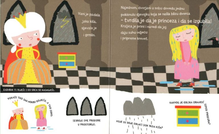 Bajka o princezi na zrnu graška prikazana je na jednostavan način prilagođen najmlađima, privlačnom ilustracijom i kratkim rečenicama. Popratna jasna pitanja koja su povezana s prizorima potiču dijete da govori o bojama, brojevima, oblicima i suprotnostima te tako razvija svoj govor i uči o svijetu oko sebe.