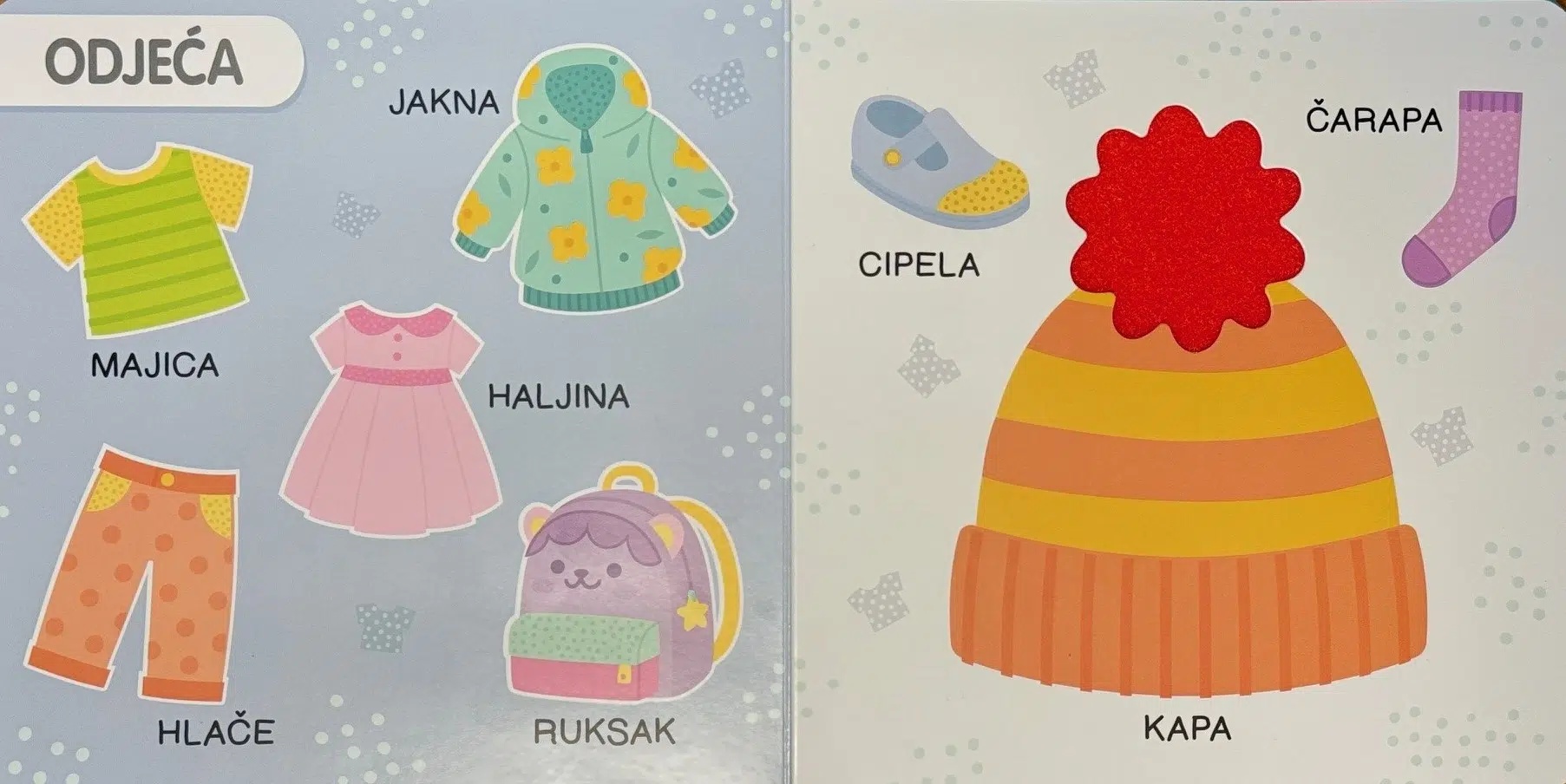 Nauči riječi, stranice istraži, izgovori glasno i prstićem pokaži. Mekano, hrapavo, sjajno ili glatko, dodirni, pomazi i nasmij se slatko.