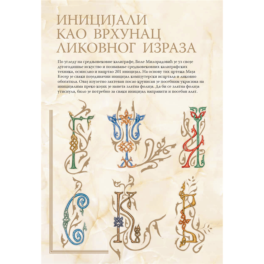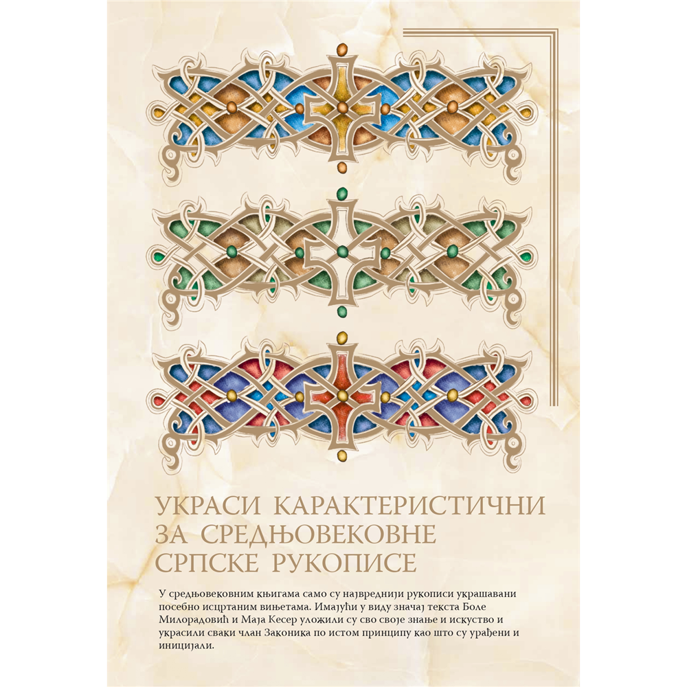 • preko 200 ručno iscrtanix i obojenih inicijala u prevodu Zakonika