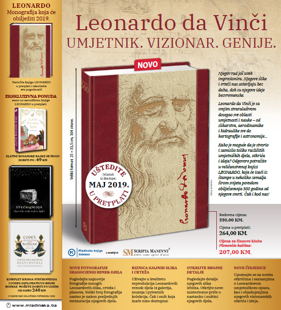 Leonardovo naslijeđe je zapanjujuće i zaista veličanstveno. U novoj, luksuznoj monografiji LEONARDO pogledajte sačuvane da Vinčijeve slike i bogat izbor njegovih najvažnijih skica. Među njima ima mnogo onih koje ćete najvjerovatnije prvi put vidjeti, ali koje su imale izuzetno važnu ulogu u umjetnikovom opusu. Upoznajte se i sa umjetničkim djelima u kojima je on bio uključen, ali saznajte i koji su Leonardovi radovi izgubljeni (vjerovatno zauvijek)!!