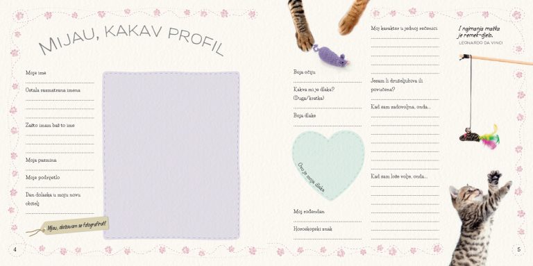 Od prvoga dana kad je vaša mačka ušla u vaš dom, ova mijautastična knjiga uspomena podsjetit će vas na najljepše trenutke koje ste proveli s njom. Zabilježite smiješne situacije i fotografirajte svojega ljubimca u raznim izdanjima, a u tome će vam pomoći kartice najvažnijih postignuća. Osim toga, pronaći ćete i tablice o mačjem zdravlju i ponašanju – neka vam budu uvijek nadohvat ruke (ili nečije znatiželjne šape). I ne zaboravite, vaša je uloga u mačjem životu savršeno jasna. Budete li ispunjavali sve mačje želje, vaša će vas mačka prihvatiti kao sustanara, a katkad i nagraditi zadovoljnim predenjem.