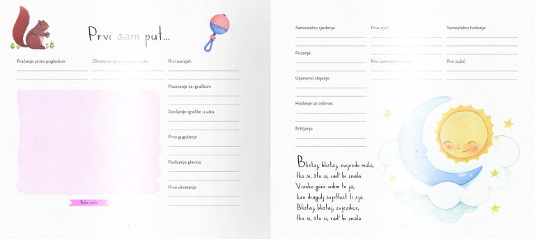 Pred vama je najveći i najljepši životni izazov – pomoći maloj bebi da postane velik čovjek. Vaša beba raste, razvija se i svaki dan nauči nešto novo – a i vi učite zajedno s njom. U ovu knjigu uspomena zabilježite nezaboravne, neponovljive, vesele i najvažnije trenutke iz prve godine života vašega djeteta kako biste sačuvali sjećanje na te vedre dane. Osim predivnih ilustracija i nježnih pjesmica i uspavanki, u knjizi uspomena pronaći ćete i kartice s najvažnijim postignućima i datumima. Bebu fotografirajte s karticom i tako zabilježite još jedan važan događaj iz njezina života.