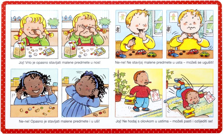Korisna slikovnica koja na jasan i poučan način djecu upozorava na opasnosti koje se kriju u kuhinji, kupaonici, parku ili igri.