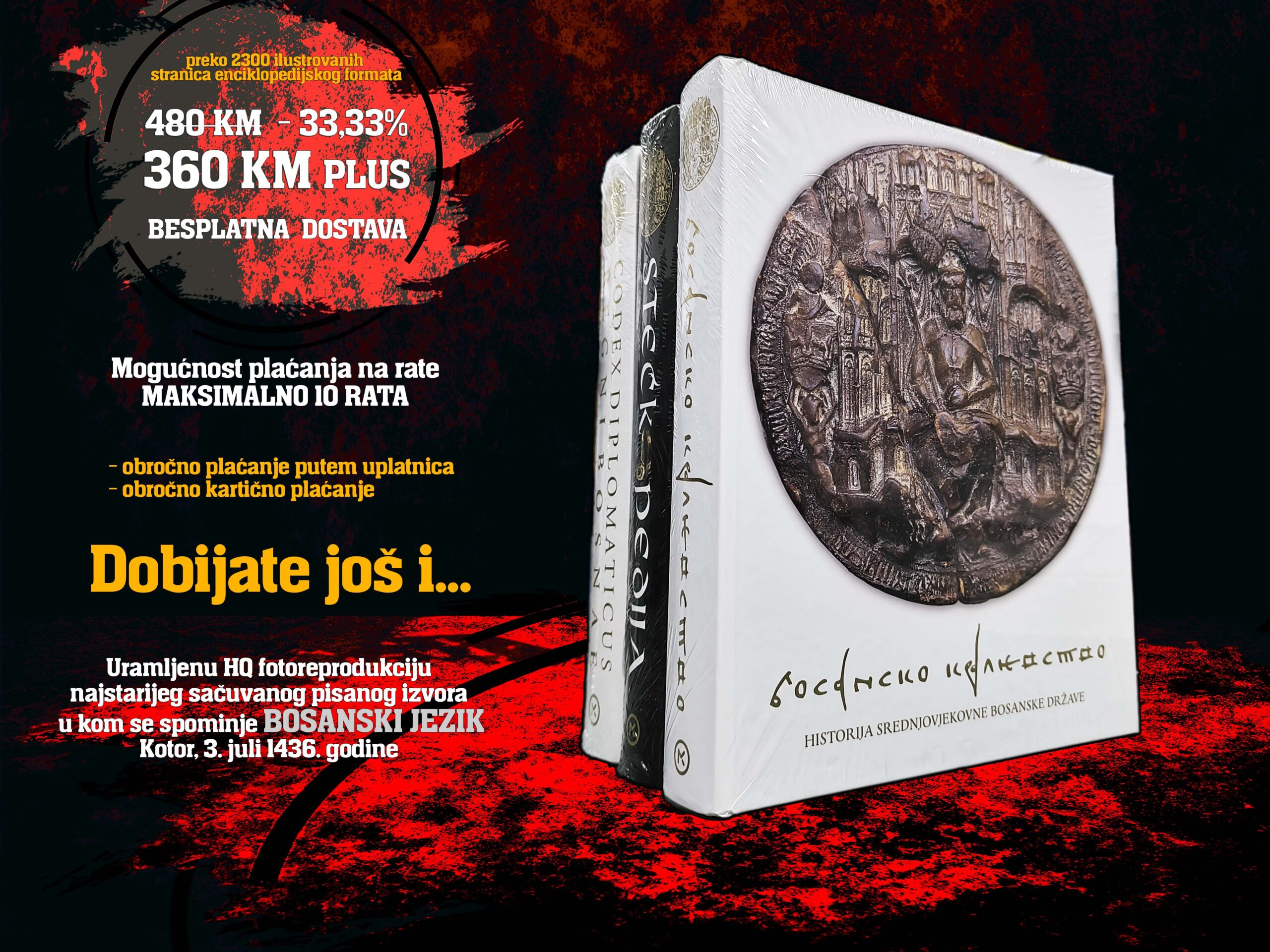 TRILOGIJA O SREDNJOVJEKOVNOJ BOSANSKOJ DRŽAVI STEĆKOPEDIJA – KAMENO BLAGO STARE BOSANSKE DRŽAVE Stećkopedija je naučno-popularna enciklopedija namijenjena širem krugu čitalaca koji se žele podrobno upoznati sa svim perspektivama ovog fenomena, ali i stručnoj javnosti kojoj će sadržaj ove enciklopedije biti iznimno dragocjen. Bogata ilustrovana monografija kamenih nadgrobnih spomenika srednjovjekovne Bosne je definitvno prva ovakve vrste u svijetu. Nastala je u želji da se ovaj temeljni fenomen srednjovjekovne sepulkralne kulture predstavi domaćoj i svjetskoj publici sa istančanim osjećajem za estetiku i opći kvalitet knjige. Stećci su duhovno kulturnohistorijsko sidro koje nas ostavlja sa osjecajem ponosa na srednjovjekovnu bosansku kulturu i umjetnost. Sličnu ambiciju ima i ova predivna knjiga – da pomogne mladim generacijama da ovaj istinski fenomen pomnije istraže i iskrenije zavole. U historiji srednjovjekovne Bosne prepoznatljivo se spominju Bosansko kraljevstvo kojim se kao uzorom diči moderna država Bosna i Hercegovina, Crkva bosanska kojom se vjerska tolerancija podiže na pijedestal moderne multireligioznosti i stećci kao najznačajniji materijalni simboli vječnosti na našim prostorima. Moderna BiH zbilja ova prva dva medievalna uzora često politizira, pokušava se to i sa stećcima ali zaista neuspješno. Stećci su opipljiva, nepobitna materijalna činjenica kojoj se ne može prigovarati modernim politikantskim podjelama. Srođena sa ambijentom kao svojevrsni inventarni izraz prirode, njihova ljepota sve razoružava, ostavlja bez daha i srećno ujedinjuje u namjeri da se očuvaju u prepoznatljivom svjetskom okruženju kao istinska svjetska baština. U posljednje vrijeme više je autora u različitom obimu nastavilo raniju liniju izdavačkih poduhvata povezanih za stećke. Značajnije se poslije Šefika Bešlagića u sintetskom izrazu izdvaja samo pristup pokojnog akademika Dubravka Lovrenovića, koji je kroz vizuru historičara, prije svega značajnom pričom o smrti, dao stećcima novi zamah u spoznaji i novim istraživanjima. Bilo je i drugih pristupa ali njihova je parcijalnost i tehnička obrada ostali su na nešto slabijem nivou. U ovakvom ozračju, gdje se kroz vizuru stećaka, već srođeni prirodni ambijent treba iznova i u drugačijem ruhu predstaviti čitaocima olakšano je pratiti izdanja u kojima se mogu uočiti stručna i naučna odmicanja vrijedna pažnje. Pristup Edina Bujaka, prvog školovanog predstavnika u ovoj branši, u polazištu zaslužuje zasebnu pozornost. Uskostručni izraz arheologa je ugaoni kamen kojim se stećci prvi put postavljaju u naučnu ravan sa jasnim presjekom dostignutih znanja i projekcijom budućih pravaca u njihovom proučavanju. Uz pomoć izdavača tom zadatku mladi autor je ponudio hvalevrijednu ponudu čiji asortiman predstavlja stećke izdanjem svjetske enciklopedije – stećkopedije. prof. dr. Esad Kurtović CODEX DIPLOMATICUS REGNI BOSNAE – VELIKA ZBIRKA STAROBOSANSKIH POVELJA Nećemo pogriješiti ako kažemo da je ova knjiga CODEX DIPLOMATICUS REGNI BOSNAE kruna najsveobuhvatnije trilogije o staroj Bosni. Prevod na moderni bosanski jezik i transkripcija preko 350 najreprezentativnijih i najzanimljivijih srednjovjekovnih bosanskih povelja i pisama sa historijskom kontekstom predstavlja najzahtjevniji izdavački poduhvat ove vrste u BOSNI I HERCEGOVINI IKADA! Diplomatički zbornik bosanske države u srednjem vijeku ovim postaje dostupan najširim slojevima stanovništva i otvara mogućnost da se bogatstvo života u srednjovjekovnoj Bosni doživi iz prve ruke – iz pera sudionika tog vremena. Na pitanje šta je i koliko je važna bila zemlja Bosna u srednjem vijeku – dokumentirani odgovori sadržani su u knjizi CODEX DIPLOMATICUS REGNI BOSNAE kao riznici istine o staroj bosanskoj državi. Značaj ove prevažne knjige prevazilazi izdavačke domete. Radi se o knjizi koja popunjava prazninu prisutnu u kulturi sjećanja naših ljudi više od 150 godina. Ovakva knjiga nikada ranije nije objavljena niti postoji išta slično. Rijetke su zemlje sa dubokom političkom i kulturnom historijom koje se mogu pohvaliti Codex diplomaticusom. Riječ urednika…  Codex diplomaticus Regni Bosnae je djelo koje će biti od višestruke i dugogodišnje koristi širokim slojevima čitalaca. Stručnjaci različitih profila koji se bave srednjovjekovnim periodom u njemu će prepoznati izuzetno korisnu zbirku izvora. Nadalje, poslužiće i kao vježbanka za usavršavanje paleografskih i prevoditeljskih sposobnosti. Običnim zaljubljenicima u srednjovjekovlje ona će ponuditi put u jedan potpuno drugačiji svijet. Svijet u kojem su vladale drugačije norme ponašanja i izmijenjen pogled na svijet u odnosu na moderno vrijeme. Što je možda i najvažnije, ovako ponuđeni izvori omogućit će svojim čitaocima (onima koji to budu željeli i budu sposobni da shvate) kako nije srednji vijek bio niti romantičarsko ružičasto, niti katastrofalno crno doba. Bosanska država imala je za to doba sve atribute karakteristične i za druge političke tvorevine – države. Ovi izvori su najdirektniji napad na različite mitove koji se danas, nažalost, množe oko bosanskog srednjovjekovlja. Dobronamjerni čitalac će preko njih moći uhvatiti pravu nit onog što je Bosansko kraljevstvo uistinu i bilo. BOSANSKO KRALJEVSTVO – HISTORIJA SREDNJOVJEKOVNE BOSANSKE DRŽAVE „Nema tu šta nema, a sve je skladno i dostojanstveno. Kao u velikom i bogatom tržnom centru u koji ulaze djeca da izaberu poklon. To je čitav arsenal prošlosti, centralna muzejska postavka po kojoj se razvojne linije i bogatstvo vremena prepoznaju u potpunosti. Zapravo ta višedimenzionalnost, bogatstvo priloga i sadržaja teksta – ta širina u prezentiranju bosanskog srednjovjekovlja, najveće je i najprijatnije je iznenađenje koje sam doživio čitajući i sagledavajući ovaj rukopis. Morao sam se odmarati dok sam ga pregledavao … valjda je t