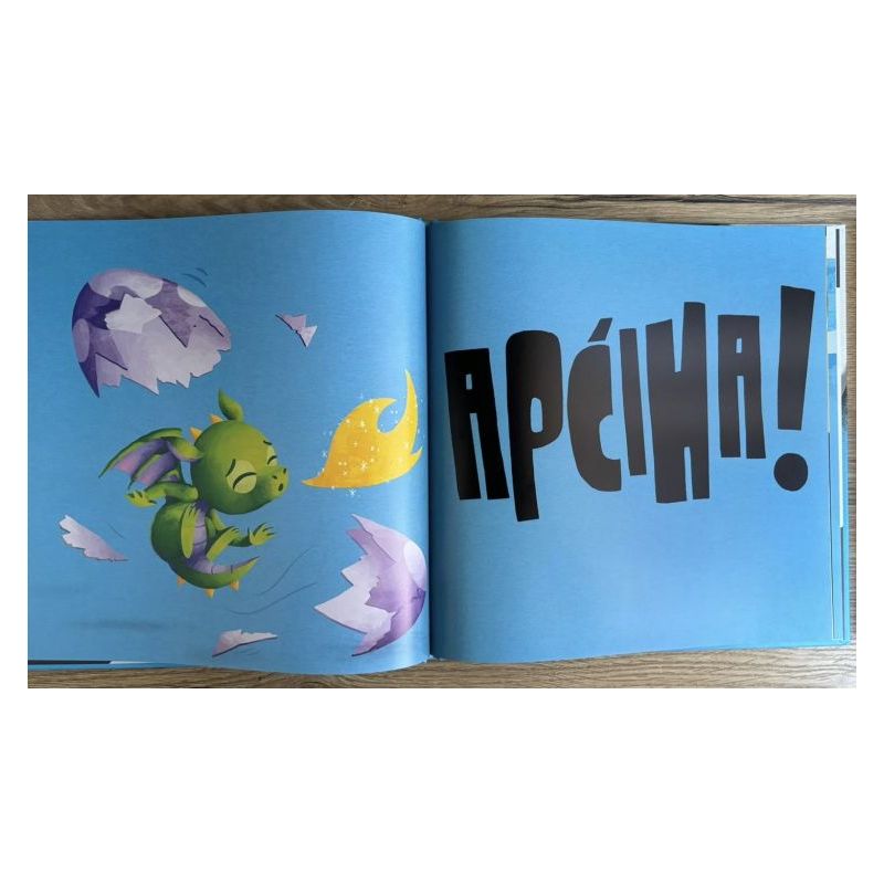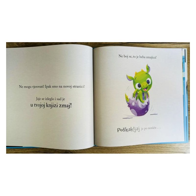 Ova slikovnica-igra nastavak je serijala svjetskih bestselera “Tko je u tvojoj knjizi?” u kojem će podjednako uživati i djeca i roditelji. Oh, gle! U tvojoj knjizi je jaje! I to kakvo! Ljubičasto je i točkasto. Jaje je napuklo i otvara se. Što god bilo, nemoj okrenuti stranicu… Ne mogu vjerovati! Ipak smo na novoj stranici! Jaje se izleglo i sad je u TVOJOJ knjizi zmaj! Ali ne boj se, to je beba zmajica. Poškakljaj je po nosiću. Hm, je li taj savjet bio dobar? APĆIHAAA! Zmajica je kihnula i… nehotice iskihala plamen. Sad smo u pravoj neprilici jer u knjizi je vatra koju moramo ugasiti. Nakon svih pokušaja moramo se poslužiti maštom. Nasred sljedeće stranice zamisli…