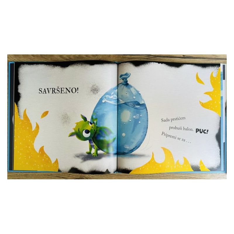 Slikovnica prepuna zmajića, kihanja, vodenih balona i sladoleda od čokolade, vanilije i jagode prokušani je recept za beskrajnu zabavu. Djeca će je obožavati tresti, škakljati, pucati prstićem izmaštane vodene balone, “mahati” stranicama poput krila da zmajica poleti. Ali prije toga trebamo svakako ugasiti vatru koju je zmajica iskihala. Na kraju, kada smo već spremni mahnuti našoj zmajici na rastanku “Doviđenja!”… Što to vidim? Čekaj malo… Što god bilo, nemoj okrenuti stranicu!