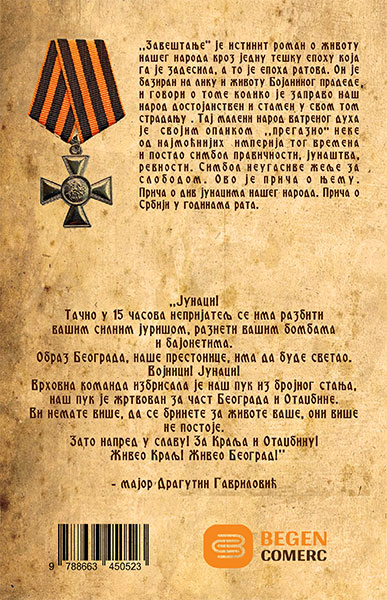 Zaveštanje je istinit roman o životu našeg naroda kroz jednu tešku epohu koja ga je zadesila, a to je epoha ratova. On je baziran na liku i životu Bojaninog pradede i govori o tome koliko je zapravo naš narod dostojanstven i stamen u svom tom stradanju. Taj maleni narod vatrenog duha je svojim opankom „pregazio“ neke od najmoćnijih imperija tog vremena i postao simbol pravičnosti, junaštva, revnosti. Simbol neugasive želje za slobodom. Ovo je priča o njemu. Priča o div junacima našeg naroda. Priča o Srbiji u godinama rata.