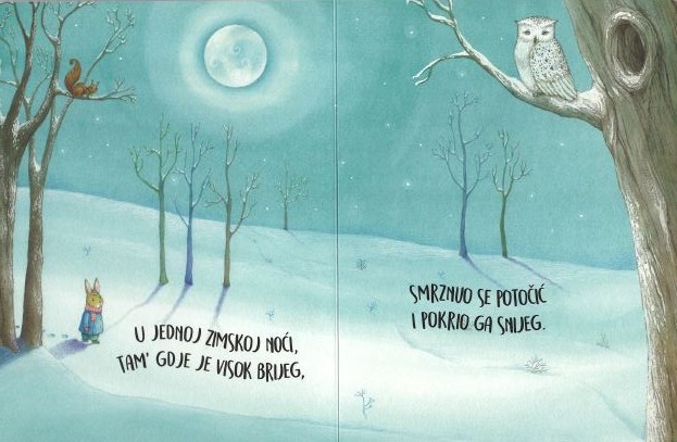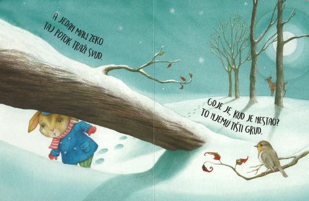 “U jednoj zimskoj noći, tam’ gdje je visok brijeg, smrznuo se potočić i pokrio ga snijeg. A jedan mali zeko taj potok traži svud…” Sjetni stihovi Branka Mihaljevića u nježnome slikovnome ruhu Marsele Hajdinjak zaslužuju posebno mjesto u zbirci slikovnica vašega djeteta.